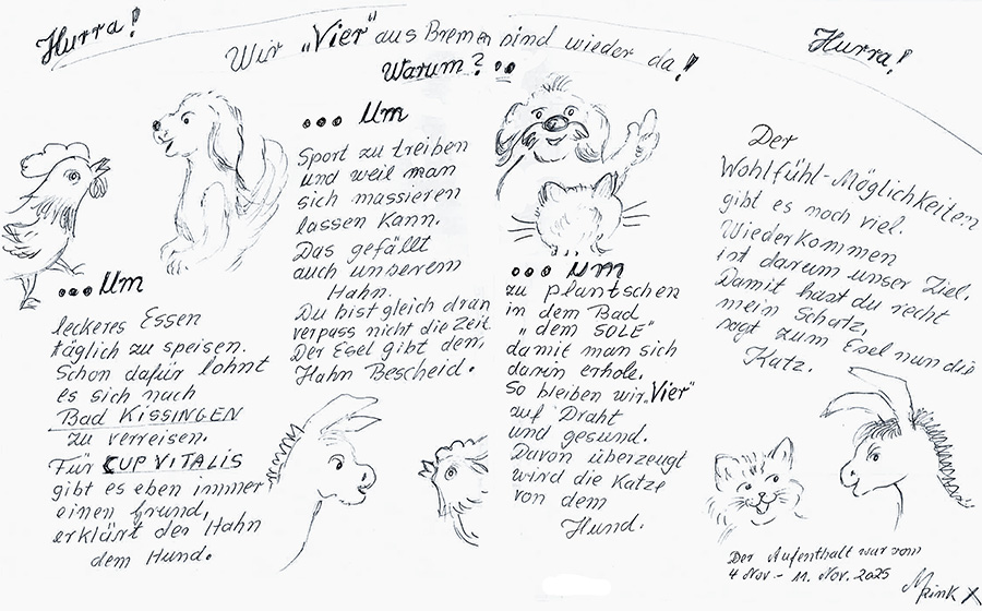 „Kissingen ist eine Reise wert, wohnen im Parkhotel nicht verkehrt. Wir lebten hier in Saus und Braus und fahren gar nicht gern nach Haus. Das Personal war hilfsbereit und nett, das Essen war toll, wir wurden fett. Doch leider müssen wir jetzt gehen, danke und Auf Widersehn!“