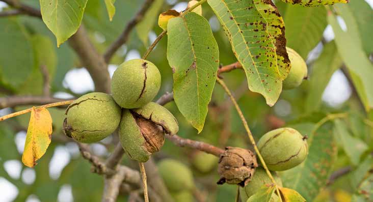 Dieser schnell wachsende Baum kann zwischen 25 und 30 Meter hoch und 200 Jahre alt werden. Die Früchte des Walnussbaums schmecken Mensch und Tier gleichermaßen.
