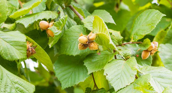 Der Haselstrauch zählt zur Familie der Birkengewächse und ist für seine essbaren Nüsse bekannt. Er hat runde, gezähnte Blätter und gelbe Kätzchen im Frühling.
